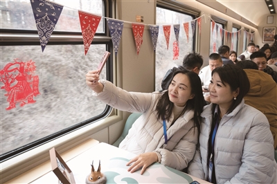11月26日,游客在Y783次“悠享龙江·银旅号”旅游列车上拍照。
