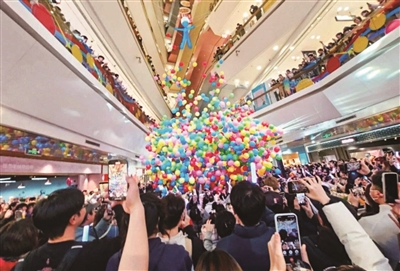 在百联又一城,近千名歌迷齐声高唱经典曲目,歌声汇聚成温暖声浪,驱散了夜的寒意,整点空降的浪漫心愿气球雨,更是将现场氛围推向高潮。