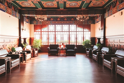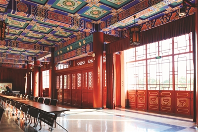 走近绿瓦大楼,典雅的琉璃屋顶、华丽的飞檐斗拱、雕梁画栋、轩栏隔扇……充满浓墨重彩的华贵气息。