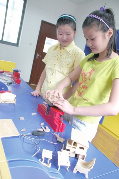 参加四平路街道图书馆暑期鲁班课堂的同学们,在指导老师示范和指导下,学习利用车床、机床、钻孔机等工具完成了一件件趣意盎然的木艺作品。