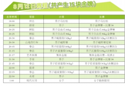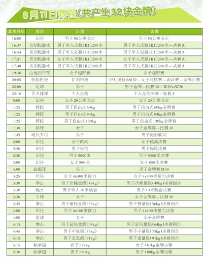 8月11日,中国的3个夺金点集中在:邹市明的男子拳击49公斤级决赛、中国跳水队在北京奥运会上唯一失金的男子单人跳台跳水、女子20公里竞走。在跆拳道和摔跤赛场,中国也会争取奖牌。