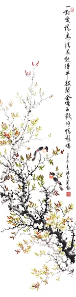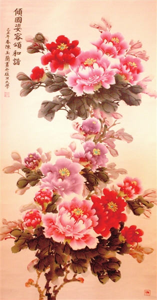 陈玉兰喜欢用鲜艳的颜色画牡丹。夺目的红、雅致的绿、娇艳的黄、高贵的紫、清幽的蓝、含羞的粉,都成为她大胆的用色,衬着墨绿的叶,看来生机盎然。众多的色彩中,她尤爱国色之红,画作之中,一眼望去常是整片醉意的红,深得透彻,深得入髓,层层叠叠的花瓣,簇拥似锦,像火一般热烈而奔放。