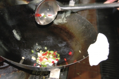 5、留少许油在锅内,加入青红椒粒、洋葱粒、香茅,煸香后加入炸好的鱼片一同翻炒;