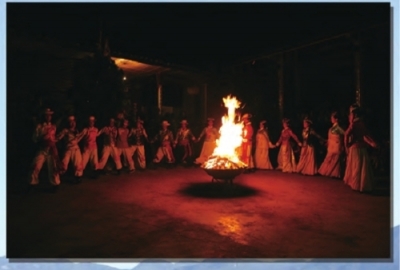 每当夜幕降临,湖边熊熊的篝火,让那一群脸上写满了喜悦的不速之客都蠢蠢欲动。淳朴、伟岸的摩梭阿哥,美丽、多情的摩梭阿妹,手拉着手热情地载歌载舞,奔放的旋律,眩晕的舞蹈,熊熊的火焰,艳丽的服装、映红的脸庞,如此欢乐流畅,如此陶醉疯狂……