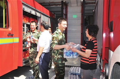“八一”建军节前夕,福宁居民区党总支的党员来到武警杨浦消防中队,慰问高温下备勤保养的消防战士,为他们送上“清凉”。■付安宁摄