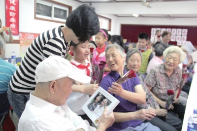 10月11日,23对来自控江路社区凤城六村的金婚夫妇,收到了同样的“惊喜”:为了让老人们度过一个特别的重阳节,居委会特地为辖区老人量身定制了“金秋十月庆金婚”免费摄影活动。据了解,其中参加活动婚龄最长的老夫妇已携手走过61年。这次活动的“摄影师”——小区志愿者陈立主动提出义务为老人们拍摄,选衣服和选背景,整整忙活了三天。凤城六村小区所在物业,上海林厦物业管理有限公司得知居委会希望为金婚老人们拍照,主动资助,把照片放大并配上相框,作为社区送给老人们的重阳节礼物。