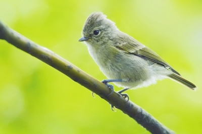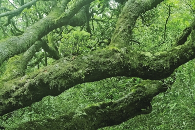 接近目的地的路上,林子越来越密,光线昏暗。典型的植被除了高山箭竹就是杜鹃和铁杉这类高大乔木。由于环境潮湿,这些植株的树干上布满青苔,其实正是金额雀鹛这类小鸟的生境,因为上面往往有它们爱吃的小虫。我们在林下等候没多久,就传来一阵鸟浪声,仔细一看是以蓝翅希鹛、火尾希鹛为主的鸟群飞到我们头顶的树冠层。虽然没见到最向往的目标鸟种,但我们还是在其中发现了金色明显的小鸟。