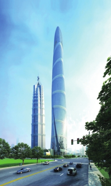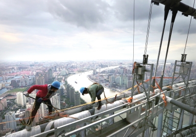 今年8月初上海中心大厦结构封顶后,只要站在市中心城区,一抬头就能看到它。虽然大楼还很“骨感”,虽然顶上还“站”着四台巨大的吊机,但它的高度已经可以俯瞰城市、一览众山小了。“上海中心”建筑总高度632米,建成后将成为上海第一高楼,主体结构高度580米,楼层数地上125层、地下5层,总建筑面积约576000平方米(地上面积373000平米),楼内安装垂直电梯91部,设9个避难层。与之相比,外滩上21栋历史建筑的总面积也不过为37200余平方米,故上海中心大厦被称为“垂直的外滩”一点也不夸张。
