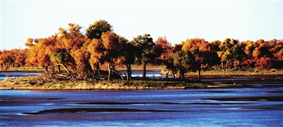 这是一个多变的树种,春夏为绿色,深秋为黄色,冬天为红色。每年深秋,是胡杨树魅力尽展的最美季节,一夜寒露会骤然把整片的胡杨树全部染黄,额济纳旗数十万亩胡杨林的树叶在阳光下金光闪闪,就像金色的海洋,与沙地、河水、蓝天、白云交相辉映,向世人展示我国西北地区独特的诗情画卷,成为众多游客和摄影爱好者的必去之地。