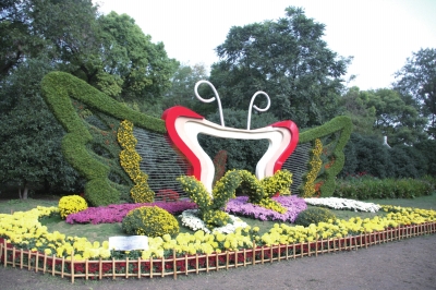 展览期间,公园充分结合现有的自然景观,从西、南大门入口互相贯通的主干道为主,沿线设置了用各类菊花妆点的狮子、大象、孔雀、海豚、鲤鱼、鸽子以及蘑菇卡通造型,与周边的花境、花群、花丛、花球、花柱融为一体,映衬出本次菊花展的园艺造型布置和菊花群体栽植效果,让游客们眼前一亮。一些年年来赏菊的老游客观展后惊呼:“今年的菊花真好看,特别是在造型设计上很有创意”。