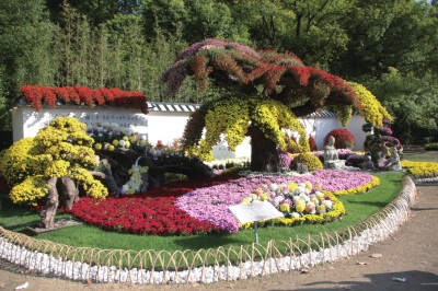 园内设置“自然之声”与“秋韵菊彩”两大主题景点展示区,共有十多个主要景点,通过现代化新型的园艺技术,以多头菊、独本菊、悬崖菊等各色菊花为造型材料,采用多样化的布展手法,将菊花与森林背景巧妙地融为一体,塑造出十余组绚丽多彩的园艺作品,展现菊花造型奇特、芬芳多姿的别样风韵。