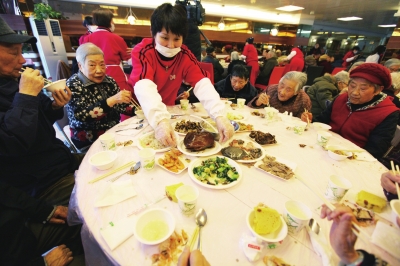 1月23日,来自延吉新村社区的30名孤老被邀请到延吉养老院团聚,与养老院的老人一起共享了一餐美味的团圆饭。自2010年以来,延吉养老院举办新春团圆饭的活动已经四个年头了,以低糖低脂、软糯的菜肴为主,适合老年人的胃口。每桌还配备了一名助餐员,为老年人夹菜分盘。 ■记者张维维摄