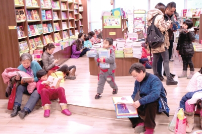 最热闹的,还是五角场商区,白天人气爆棚,夜晚车水马龙。在上海书城五角场店,孩子们书海漫游度佳节。