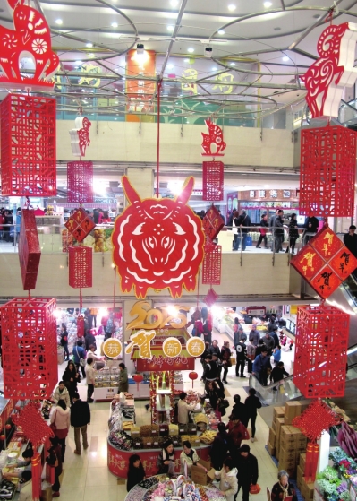 从大年三十始,吃一顿合家团圆的年夜饭,是中国人最期待的。第一食品五角场店、欧尚超市中原店内红红火火,灯笼、剪纸处处可见,节日商品货源充足,购买年货的市民络绎不绝。