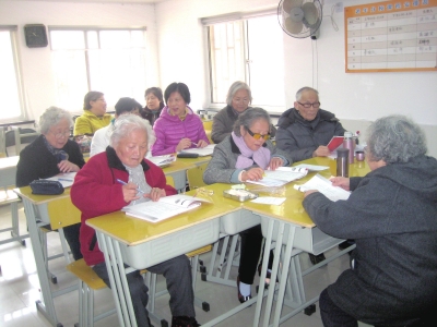 其中最具特色的当属“老年英语学习班”,这是一个特殊的英语学习班,老师和学生都是社区的退休老人。上课的洪优莲老师是归国华侨,有一口流利地道的英式英语,退休前担任上海理工大学英语教研系副主任。洪优莲已连续十多年为社区老人义务教授英语,每周一次的英语课,洪老师风雨无阻,每次课都是第一个到教室,先在黑板上列提纲、写重点。