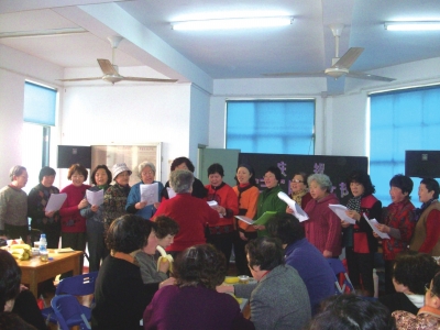 每周一、周四上午,学习点会传来阵阵歌声,那是独居老人在蒋蕴玉的带领下练习唱歌。在这里,大家尽情欢歌,忘却了烦恼,忘却了孤独,忘却了年龄。在为社区老人过生日时,蒋老师自编的《老年朋友来相会》博得了热烈的掌声。每年的妇女节,合唱团都会为大家献上一台精彩纷呈的演出,献上一束用丝袜做成的“康乃馨”。这位被大家称为“蒋老师”的,是一位八十多岁的老人,她教大家唱歌、做手工、做编织,使老人在学习和娱乐中得到了精神慰藉。