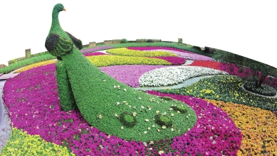 而“花千雀”是本届菊展的亮点之一。在百花园里,杭白菊和20多种欧美小菊、荷兰菊打造出了一片近万平方米的异域菊海,一条条菊花带构成的彩虹小径,将整个百花园自然分割成若干条高低起伏的花带。在令人眼花缭乱的色彩线条里,一只高达4米的“孔雀”优雅地栖息在这片七彩花海中,它的羽衣由上千朵小菊和红绿草打造而成,飘逸的尾屏自然下垂,标志性的眼斑被菊花勾勒得栩栩如生,整个孔雀造型呈现回首凝望的姿态,仿佛留恋于眼前的美景不愿离开。