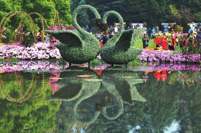 巨大的彩蝶,纯洁的天鹅,宏伟的巨型宝瓶,精致的林中花屋,浪漫的爱之门廊,传统的金山白墙、黛瓦、观音兜……在室外展区,园方布置了九处立体景点,这些景点在设计时以“绿色森活”为主题,用菊花为主体,配合其他艺术元素搭建而成,旨在表达人与自然的和谐。