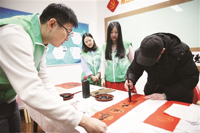 写春联、送春联的节前传统活动仍人气高涨,江浦路街道特邀鞍山初级中学学生及江浦海艺书画院的书法团队在江浦公园为社区居民现场免费书写春联;金上海小区居民王江林等也在居委会老年活动室挥毫泼墨,每一处活动现场都挤满了前来领春联的市民,送出的每一副春联,不仅承载着美好的祝愿,还饱含着浓浓的睦邻情。