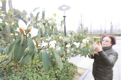随着天气逐渐回暖,黄兴公园枝头上的含笑玉兰也竞相开放,吸引游客们前来驻足观赏。■记者 王修远 摄