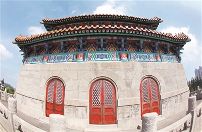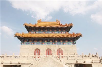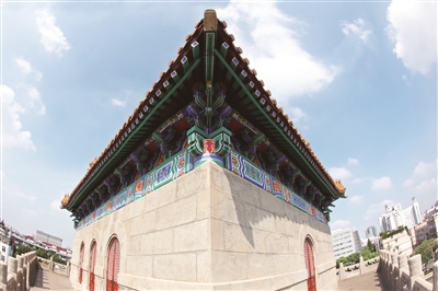 门楼的修复也是一大亮点。门楼形似北京钟楼,与现位于长海医院的“旧上海市博物馆”形成“左鼓右钟”的中国传统规划格局。门楼正面为三孔券门,四周围以仿石造望柱栏杆,屋顶为重檐歇山顶。在屋面修复过程中发现,有四分之一的琉璃瓦片保存较为完整可以再次利用。其余瓦片,则根据瓦片背后的原始制造工厂名称在江苏宜兴找到相关厂家,按原尺寸和形制进行了复原。修复后的黄色琉璃瓦屋面以及屋檐下的斗拱彩画,使门楼成为整个建筑的视觉中心。