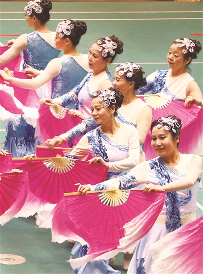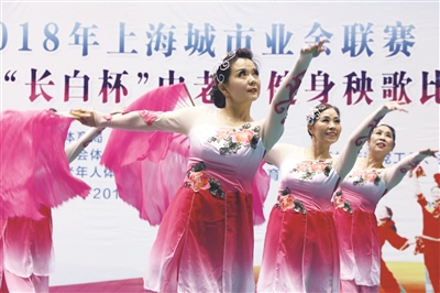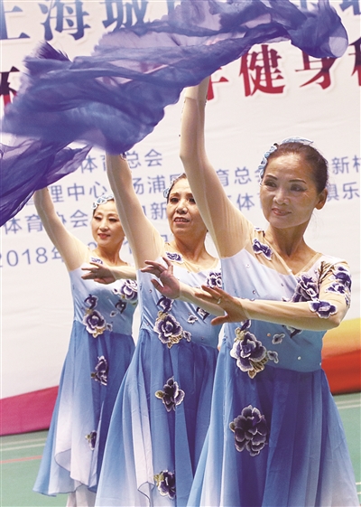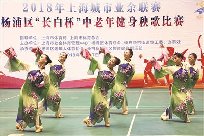 鼓槌上的彩带上下翻飞,八角巾手绢斗出簇簇繁花。10月17日,2018年上海城市业余联赛杨浦区“长白杯”中老年健身秧歌比赛在杨浦体育馆举行,来自本区11个街道(镇)的秧歌代表队身着艳丽服装,手持彩扇、彩绸,展现出非凡的舞蹈功底。