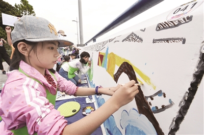 近日,“彩绘钱塘”活动在浙江杭州钱塘江北岸的江干区段举行,500余名参与者在500米长的江堤护栏上描绘了82幅(组)以“拥江发展”和“美丽河湖”为主题的作品,旨在倡导生态环境共建共享理念,推进钱塘江文化建设。图为学生们在钱塘江的江堤护栏上绘制彩绘作品。 ■新华社 李忠 摄