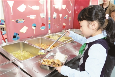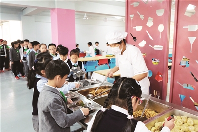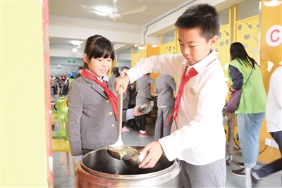 “自助午餐”在全校铺开后,低年级的孩子也加入到自己动手盛饭舀汤的行列,这对于在“421”家庭模式中成长的孩子来说,是一个不可多得的锻炼机会。“起初,孩子们在打菜时两只小手颤颤巍巍的,米饭盛不起来,汤也端不稳。”周珺告诉记者,经过数次反复探索,熟知“自取餐具、自取餐食、自取汤品”的流程后,孩子们渐渐学会餐具的使用,并自觉养成了按需取餐、少盛多添的习惯。