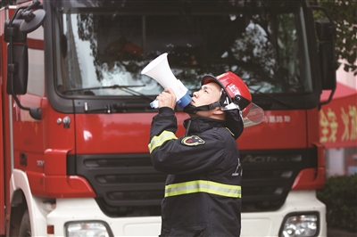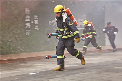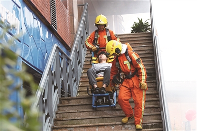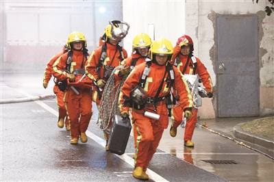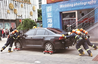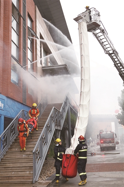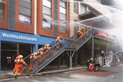 本报讯 11月17日下午,五维婚纱摄影文创园区内,一道刺耳的火灾自动报警器声划破天空的沉寂。杨浦区消防支队正在这里开展文创园区灭火救援应急演练。演练假设园区内某号楼3层办公室内部因电线短路引发火灾,导致大量人员被困。公安、消防、医疗、供水、供电、供气等应急联动力量联合展开救援行动。