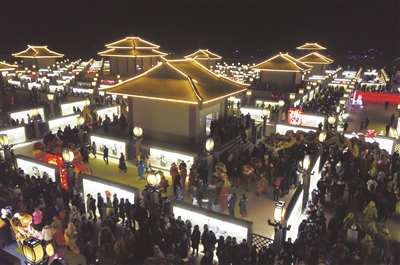 2月12日,位于甘肃省张掖市甘州区碱滩镇古城村的九曲黄河灯阵正式亮灯开放,吸引大量游客前来观灯、游阵、祈福。图为游人在张掖市甘州区碱滩镇古城村九曲黄河灯阵游览(无人机拍摄)。■新华社 范培珅 摄