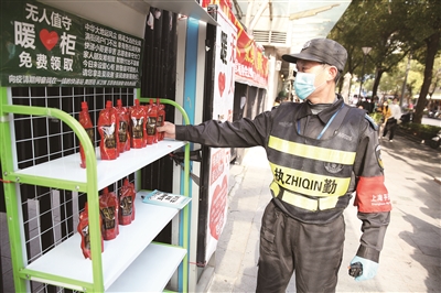 短短半小时,柜上的物品就被领走大半。随后,一位市民拎着两箱饮料过来“补货”。他就是暖心柜的发起者乔治,大学路沿街商户中的一员。“我喜欢大学路,对这里有感情,看到这么多人奋战在抗疫一线,就想为他们做点什么。”乔治告诉记者,今年2月,他网购了100斤番茄和大量牛奶,分发给志愿者,此举获得大家的一致点赞。但乔治总觉得自己做得还不够,于是萌生了在大学路设置一座暖心柜的想法,柜上摆放一些食品、饮料,供一线工作者取用。暖心柜尽量设在自己工作室附近,这样便于了解物品领取情况,及时补货。乔治的这一想法得到了物业的大力支持。3月10日,这座无人值守暖心柜应运而生。