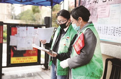 在新江湾家苑小区门岗,经常能看到这对母女,穿着绿色志愿者背心,为进出小区的居民测量体温,耐心地登记返沪人员信息,发放小区出入证。