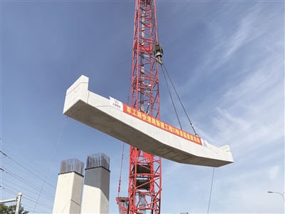 预制拼装工艺是工程实现快速施工的又一“法宝”。“以前,立柱、盖梁需要在现场一根一根地用混凝土浇筑出来,做好一根立柱、盖梁基本需要用时一周左右。如今,我们把这个工序搬到了工厂,可以实现批量化制作。在工厂预制好的立柱、盖梁,再运到现场进行吊装,这就像‘搭积木’一样,速度非常快,在现状市区区域施工条件下,一天下来,可以保证吊装4根立柱或者至少2片盖梁。”