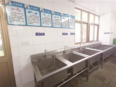 后厨内,设备干净锃亮,洗好的食材分类分筐摆放。“视频监控全联网接入教育安全管理中心,学校管理人员可以随机调取查看,发现不规范的地方及时纠正和处理。”杨浦小学副校长赵静菡介绍,除了后厨备餐规范化操作,学校对环境卫生等也有明确要求,例如食堂每餐必须对食材留样封存,以便监管部门查验;严格实施食品原料采购记录和索证索票制度,确保每类产品都可追溯来源。