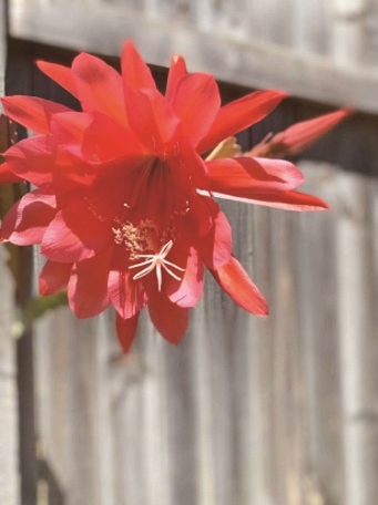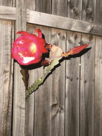 我没见过昙花,更别说昙花绽放了。晚饭后,我每隔半小时,去看一次花开了吗?澳洲夏令时9时许,原先的苞蕾张开了。硕大的花朵,红得发亮,不照明也看得清。我视若珍品,拍下几张。此后三天,我进出总会近前凝视,记下它细微的变化,花朵不谢,鲜红如初,四天后开到极致了。心想“昙花一现”的说法,需要修正。