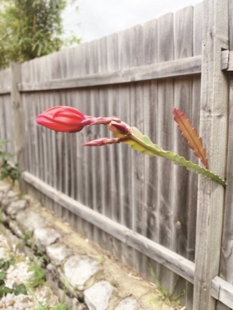 傍晚,儿媳兴冲冲回家,一边拨弄看手机,一边说谭老师家的“昙花”开到我们家了。听她这么一说,一家人顾不得吃饭了,跑到前庭看“昙花”了。果然,从栅栏缝中伸过来一杆“红缨枪”似的花茎,茎头三颗鲜红的花蕾,中间一颗微微张开,旁边两颗含苞欲放。