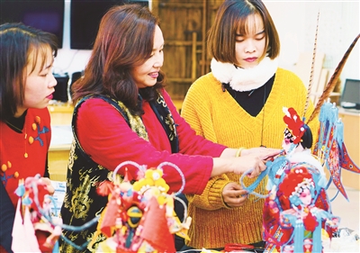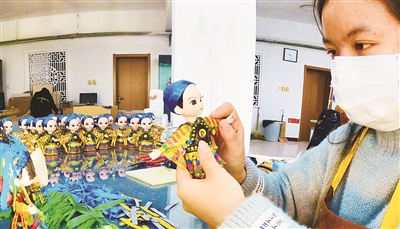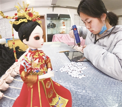 在位于北京通州区张家湾镇的唐人坊,来自贵州的布依族姑娘罗金风正在制作北京绢人。