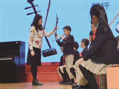 活动一开始,上海音乐学院实验学校教师吴佳音,带领学校四年级学生呈现了一堂生动的课堂实践活动:欣赏民乐合奏《幸福年》。吴佳音以复习民族拉弦乐器二胡为切入点,带领同学们认识了二胡的“小伙伴们”——高胡、京胡、板胡,感知辨别他们在外形、音色和演奏方式上的区别。