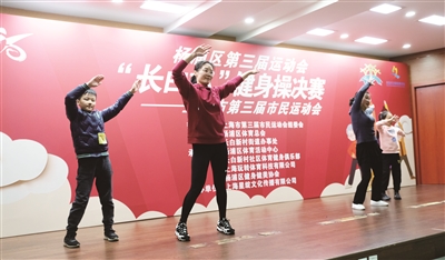 今年4月起,主办方在全区范围内推出了健身操项目的初赛、复赛,共吸引了7400余人参加。比赛同时开放了线上参赛和线下参赛两种方式,竞赛项目健身操动作简单易学、老少皆宜,具有广泛的群众基础。比赛初期,社区居民们通过线上平台进行展示交流,最终评选出29位选手晋级决赛。