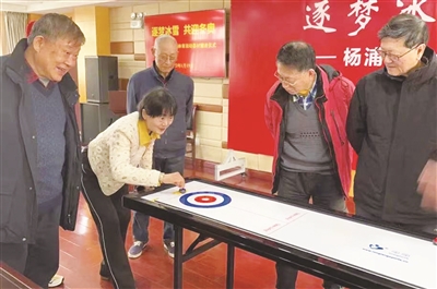 听说打冰壶能强身健体,使手脚更灵活,老同志们跃跃欲试、自行组队,开展了一场冰壶运动比赛。白色的长桌上推球对垒,跨步下蹲、瞄准推球,轻轻前掷、滑出直线……虽然是第一次接触桌上冰壶,但老同志们上手很快,模拟冰球在冰面上的滑动感和撞击感,玩得不亦乐乎。“运动员在场上为国争光,我们在场下为冬奥呐喊助威。”老同志们纷纷表示。