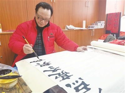在一众书法作品中,五角场街道书画社副会长汤贵强书写的“迎接冬奥、振兴中华”,赢得了大家的一致好评。平时擅长隶书和正楷的他,此次选择以草书书写,“一开始有考虑过用正楷写法,但在写这幅字时内心很激动,我觉得草书更能抒发情感,而且草书写法能把这8个字写得更有动感,比如‘迎’字的走之底就像滑板,‘接’字中的‘女’字也十分灵动。”汤贵强告诉记者。