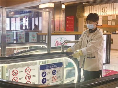 街区内,保洁人员强化了消毒消杀工作及频率,每隔两小时对扶梯、垃圾桶等公共区域和设施进行擦拭消毒,每隔一小时对卫生间进行消杀。各商户在自己的经营区域按要求完成消杀工作,商场工作人员每天上门检查消杀记录表及体温监测表。“每天上班的第一件事就是测量体温,一天测4次。店内每天清洁、消毒4次,确保购物环境安全。”一位商户告诉记者。
