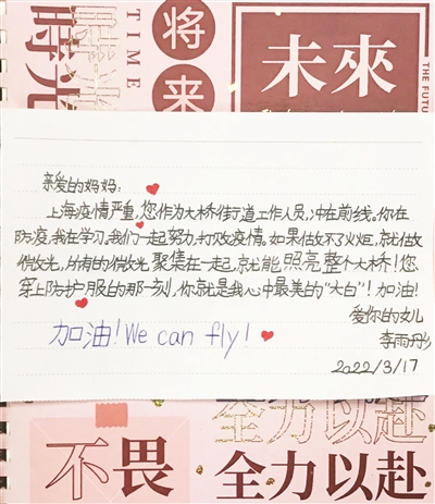 “吴坤林同学,你好,我们是五角场街道北茶园居委的叔叔阿姨,给你写这封信,是想告诉你,你有一个勇敢坚强,心怀大爱的妈妈……请代我们谢谢你妈妈,亲一下我们北茶园社区的优秀成员。”