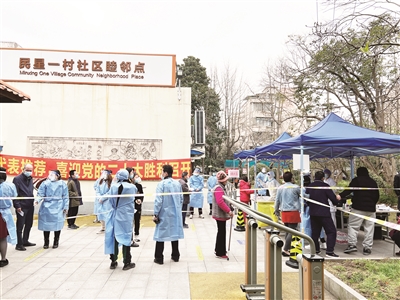 3月19日下午,记者来到了殷行街道某小区,顺着门口的喇叭声和警示牌的指引,很快就来到了核酸检测的点位。