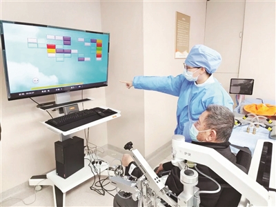 在医生做完一系列评估工作后,把患者信息录入电脑,画面上就会显示一个游戏界面。射击、切水果、俄罗斯方块,每个游戏对应了不同的手部关节运动。冯先生在欢声笑语中不知不觉就得到了手部全关节的运动训练,“没想到康复锻炼也能如此有趣,每一次游戏结束后通过成绩可以让我清楚地知道有没有进步,在玩乐中让我增强了康复的信心。”除了玩游戏,冯先生还体验了大型康复设备——上肢机器人训练仪器,他的女儿说:“这里的仪器这么先进,和我们想象中的康复不太一样,这次我们选对了。”