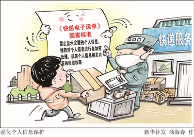 近日实施的《快递电子运单》国家标准强化个人信息保护,禁止显示完整的个人信息,推荐对个人信息进行全加密处理,规范个人信息相关内容的读取权限。 ■新华社 商海春