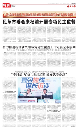 本报讯 专项民主监督已成为民主党派践行“两个融入”的重要方式、发挥新型政党制度优势的重要平台。7月24日,市人大常委会副主任、民革市委会主委徐毅松率民革市委会专项民主监督调研组,来杨浦开展“积极推进新型工业化,服务高质量发展首要任务”专项民主监督。