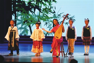 舞台上,灯光璀璨。只见上海爱乐乐团演奏队与新江湾城街道社区舞蹈队先后亮相,前者演奏琵琶、二胡、中阮等民乐乐器,声声欢快悠扬,后者身着白裙翩翩起舞,步步姿态轻盈……