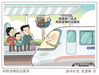 据新华社 4月8日起,铁路部门在京沪高铁部分车次试点“隔离运输、人宠分开、专人看护”的高铁宠物托运服务,铁路12306同步推出“宠物托运”功能,旅客提前2天及以上线上预约,预约成功后可同车托运1只家庭驯养且健康状况良好、单只体重不超过15公斤、肩高不超过40厘米的猫、犬类宠物。