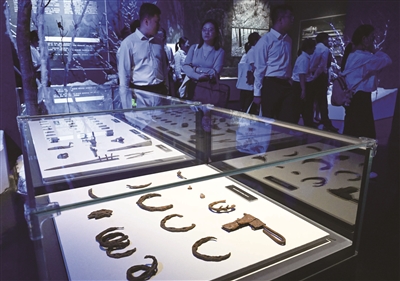 特展以“密林考古—绝境苦斗—浴血奋战—丰碑永存”为叙事主线,以历史文献和考古资料为依据,将珍贵文物、档案文献、历史影像、历史场景进行立体呈现。■新华社记者 李贺 摄